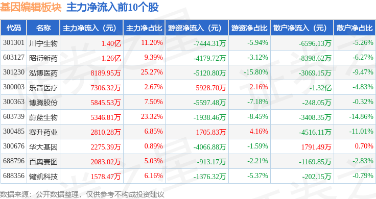 从资金流向上来看,当日基因编辑板块主力资金净流入4.32亿元,游资资金净流出1.51亿元,散户资金净流出2.81亿元。基因编辑板块个股资金流向见下表: