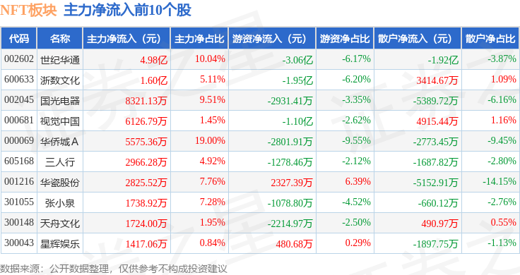 从资金流向上来看,当日NFT板块主力资金净流出82.62亿元,游资资金净流入19.72亿元,散户资金净流入62.9亿元。NFT板块个股资金流向见下表: