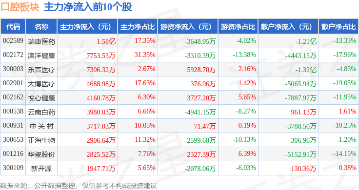 从资金流向上来看,当日口腔板块主力资金净流出5.97亿元,游资资金净流入1.72亿元,散户资金净流入4.24亿元。口腔板块个股资金流向见下表: