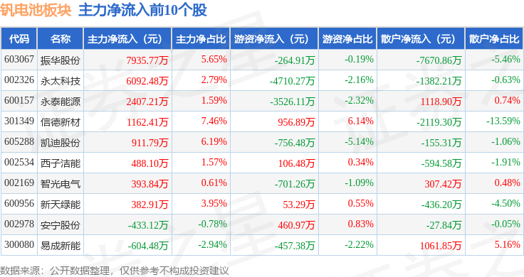 从资金流向上来看,当日钒电池板块主力资金净流出10.93亿元,游资资金净流入2.02亿元,散户资金净流入8.91亿元。钒电池板块个股资金流向见下表: