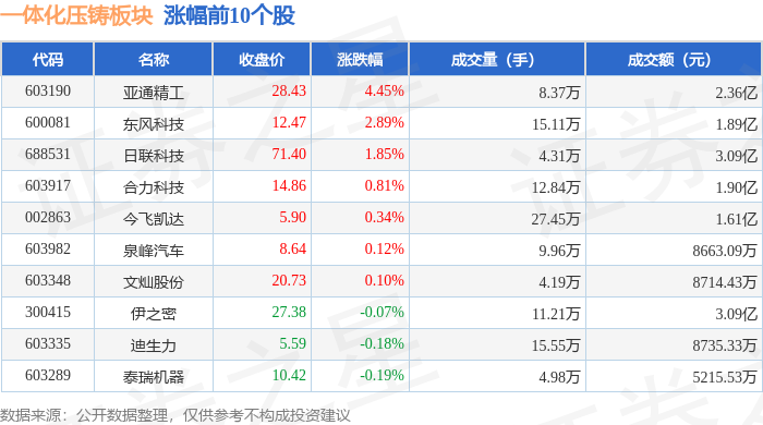 从资金流向上来看,当日一体化压铸板块主力资金净流出11.42亿元,游资资金净流入1228.14万元,散户资金净流入11.29亿元。一体化压铸板块个股资金流向见下表: