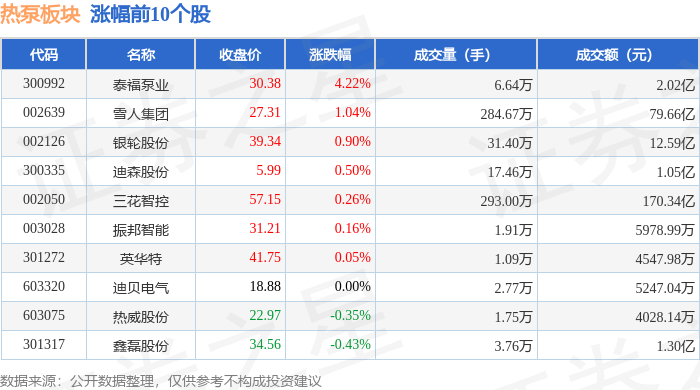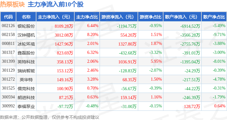 从资金流向上来看,当日热泵板块主力资金净流出8.42亿元,游资资金净流出2.71亿元,散户资金净流入11.14亿元。热泵板块个股资金流向见下表: