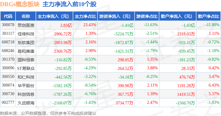 从资金流向上来看,当日DRGs概念板块主力资金净流出4.98亿元,游资资金净流出2.59亿元,散户资金净流入7.57亿元。DRGs概念板块个股资金流向见下表: