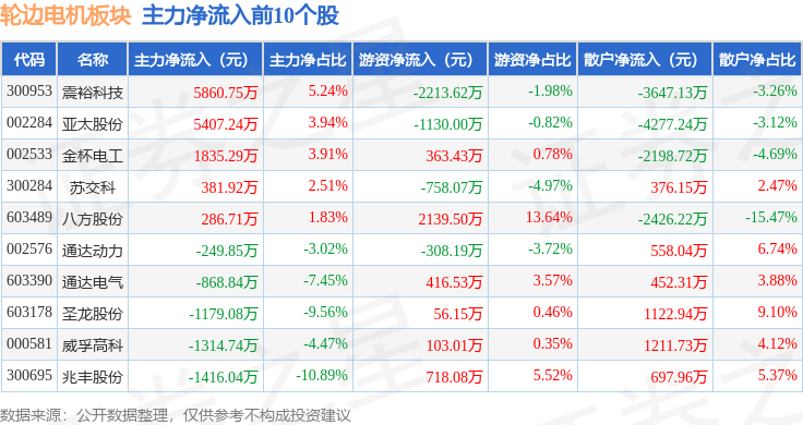 从资金流向上来看,当日轮边电机板块主力资金净流出10.24亿元,游资资金净流入5204.97万元,散户资金净流入9.72亿元。轮边电机板块个股资金流向见下表: