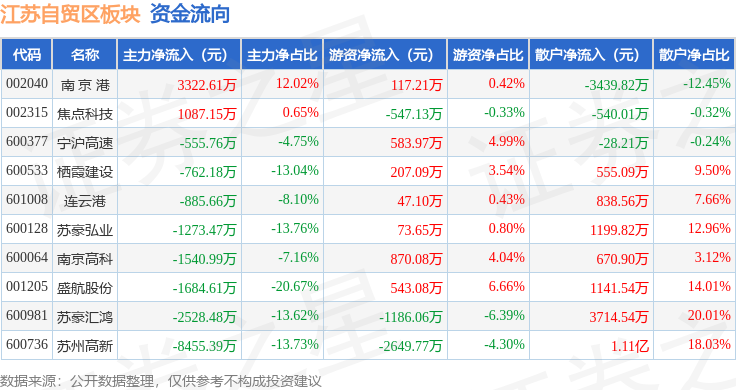 从资金流向上来看,当日江苏自贸区板块主力资金净流出1.33亿元,游资资金净流出1940.79万元,散户资金净流入1.52亿元。江苏自贸区板块个股资金流向见下表: