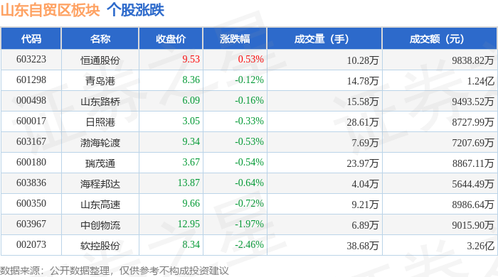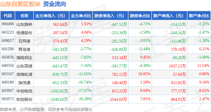 从资金流向上来看,当日山东自贸区板块主力资金净流出6830.33万元,游资资金净流入3031.79万元,散户资金净流入3798.54万元。山东自贸区板块个股资金流向见下表: