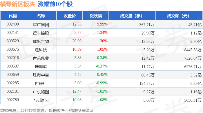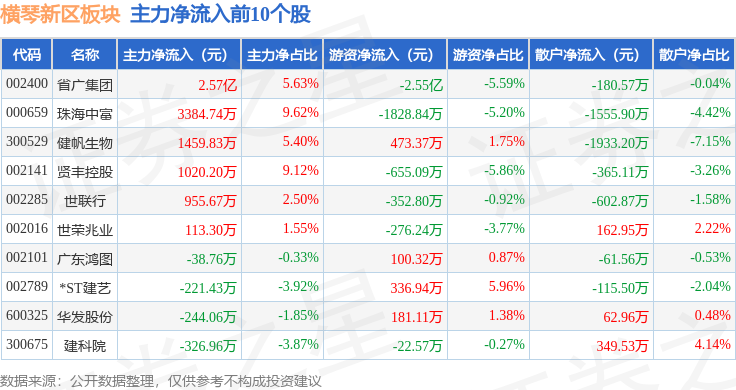从资金流向上来看,当日横琴新区板块主力资金净流出1.54亿元,游资资金净流出1.77亿元,散户资金净流入3.3亿元。横琴新区板块个股资金流向见下表: