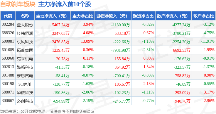 从资金流向上来看,当日自动刹车板块主力资金净流出27.15亿元,游资资金净流入5.65亿元,散户资金净流入21.5亿元。自动刹车板块个股资金流向见下表: