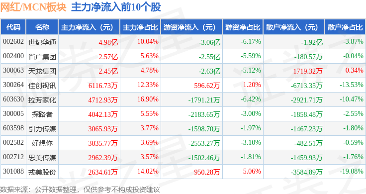 从资金流向上来看,当日网红/MCN板块主力资金净流出90.2亿元,游资资金净流入21.78亿元,散户资金净流入68.42亿元。网红/MCN板块个股资金流向见下表: