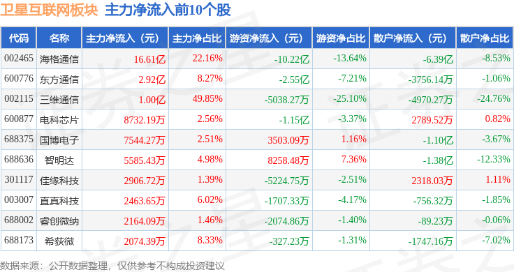 从资金流向上来看,当日卫星互联网板块主力资金净流出242.43亿元,游资资金净流入60.89亿元,散户资金净流入181.54亿元。卫星互联网板块个股资金流向见下表: