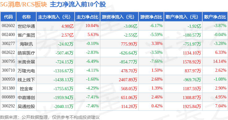 从资金流向上来看,当日5G消息/RCS板块主力资金净流出68.71亿元,游资资金净流入21.77亿元,散户资金净流入46.95亿元。5G消息/RCS板块个股资金流向见下表: