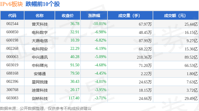 证券之星消息,1月13日IPv6板块较上一交易日下跌3.56%,普天科技领跌。当日上证指数报收于4138.76,下跌0.64%。深证成指报收于14169.4,下跌1.37%。IPv6板块个股涨跌见下表: