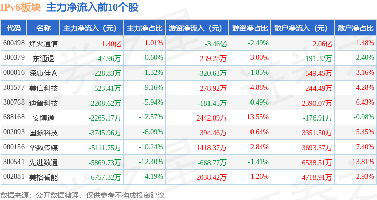 从资金流向上来看,当日IPv6板块主力资金净流出45.08亿元,游资资金净流入14.27亿元,散户资金净流入30.81亿元。IPv6板块个股资金流向见下表: