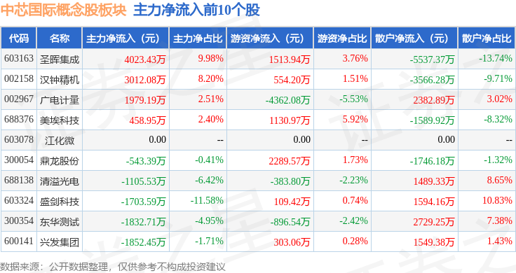 从资金流向上来看,当日中芯国际概念股板块主力资金净流出63.27亿元,游资资金净流入20.26亿元,散户资金净流入43.01亿元。中芯国际概念股板块个股资金流向见下表: