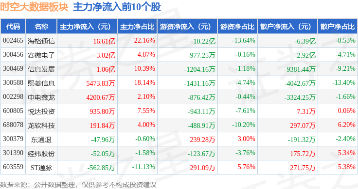 从资金流向上来看,当日时空大数据板块主力资金净流出10.26亿元,游资资金净流出2.9亿元,散户资金净流入13.16亿元。时空大数据板块个股资金流向见下表: