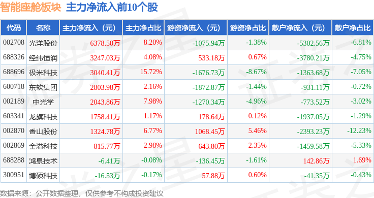 从资金流向上来看,当日智能座舱板块主力资金净流出49.11亿元,游资资金净流入13.09亿元,散户资金净流入36.02亿元。智能座舱板块个股资金流向见下表:
