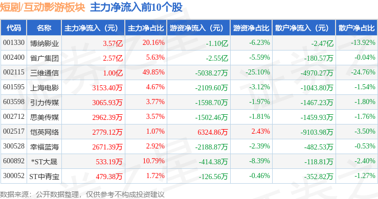 从资金流向上来看,当日短剧/互动影游板块主力资金净流出46.72亿元,游资资金净流入6.37亿元,散户资金净流入40.34亿元。短剧/互动影游板块个股资金流向见下表: