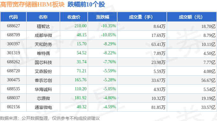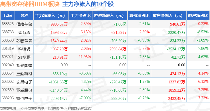 从资金流向上来看,当日高带宽存储器HBM板块主力资金净流出29.67亿元,游资资金净流入7.35亿元,散户资金净流入22.32亿元。高带宽存储器HBM板块个股资金流向见下表: