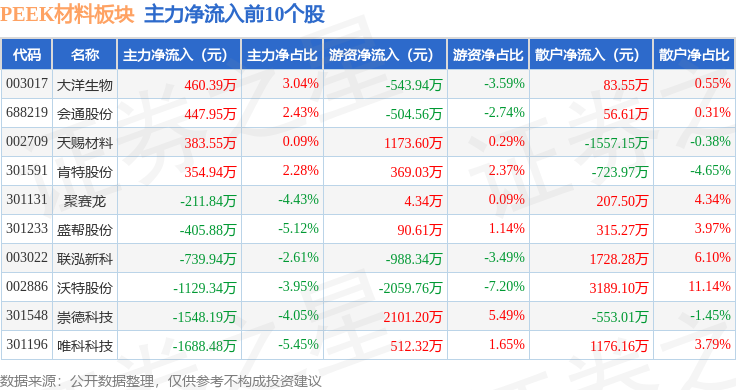 从资金流向上来看,当日PEEK材料板块主力资金净流出16.68亿元,游资资金净流入3.04亿元,散户资金净流入13.64亿元。PEEK材料板块个股资金流向见下表:
