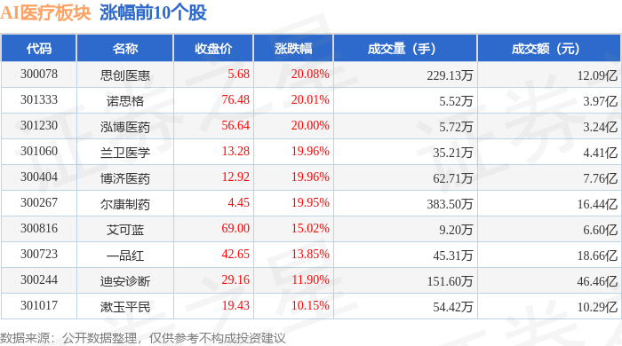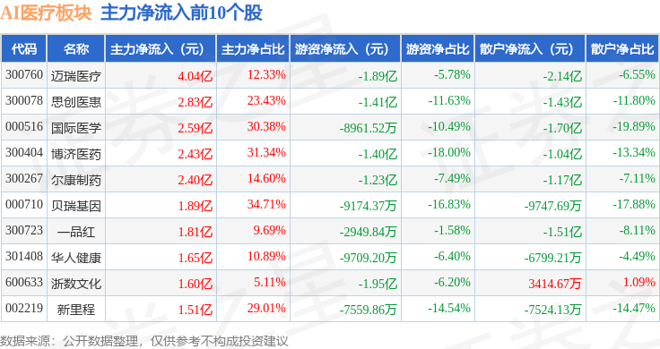 从资金流向上来看,当日AI医疗板块主力资金净流入782.86万元,游资资金净流出9.88亿元,散户资金净流入9.8亿元。AI医疗板块个股资金流向见下表: