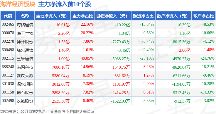 从资金流向上来看,当日海洋经济板块主力资金净流出46.6亿元,游资资金净流出8.27亿元,散户资金净流入54.87亿元。海洋经济板块个股资金流向见下表: