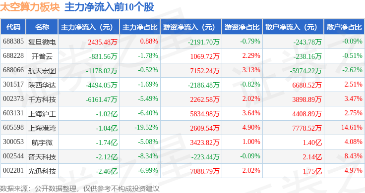 从资金流向上来看,当日太空算力板块主力资金净流出124.3亿元,游资资金净流入40.72亿元,散户资金净流入83.58亿元。太空算力板块个股资金流向见下表: