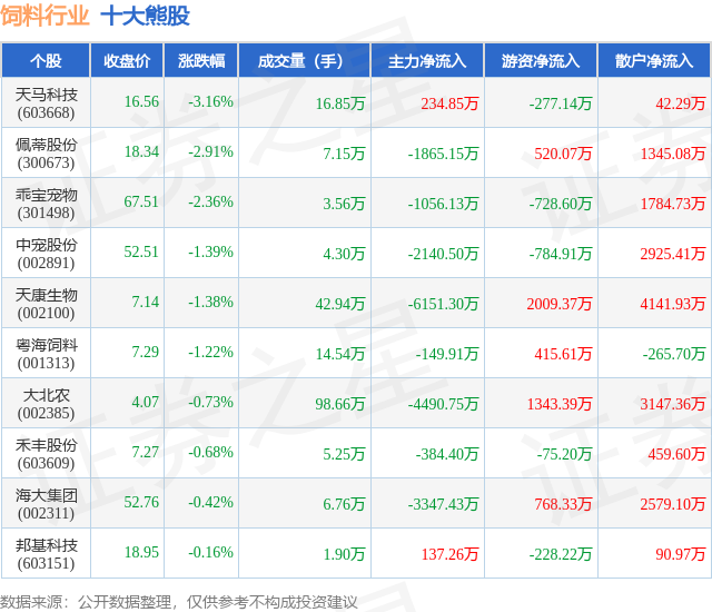 个股表现方面,饲料行业当日领跌股为天马科技(603668),该股当日报收16.56,下跌3.16%,成交量16.85万,主力资金净流入234.85万元。佩蒂股份(300673)以下跌2.91%紧随其后,该股当日成交量7.15万,主力资金净流出1865.15万元。除此之外,乖宝宠物(301498)、中宠股份(002891)、天康生物(002100)均进入当日熊股之列。具体个股列表见下表: