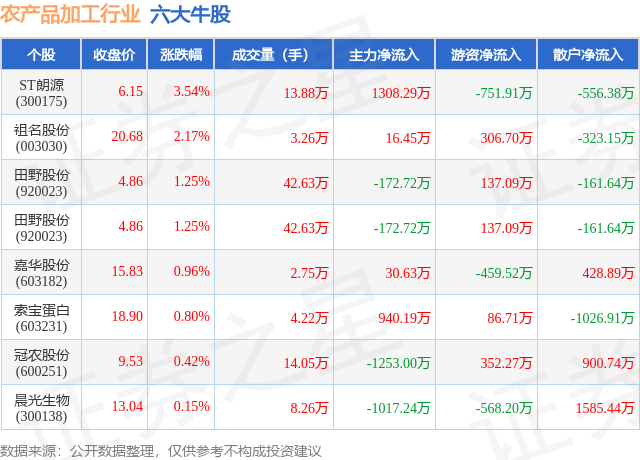 个股表现方面,农产品加工行业当日领涨股为ST朗源(300175),该股当日报收6.15,上涨3.54%,成交量13.88万,主力资金净流入1308.29万元。祖名股份(003030)以上涨2.17%紧随其后,该股当日成交量3.26万,主力资金净流入16.45万元。除此之外,田野股份(920023)、田野股份(920023)、嘉华股份(603182)均进入当日牛股之列。具体个股列表见下表: