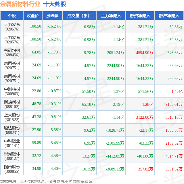 个股表现方面,金属新材料行业当日领跌股为天力复合(920576),该股当日报收100.5,下跌16.24%,成交量10.98万,主力资金净流出1.14亿元。天力复合(920576)以下跌16.24%紧随其后,该股当日成交量10.98万,主力资金净流出1.14亿元。除此之外,有研粉材(688456)、惠同新材(920751)、惠同新材(920751)均进入当日熊股之列。具体个股列表见下表: