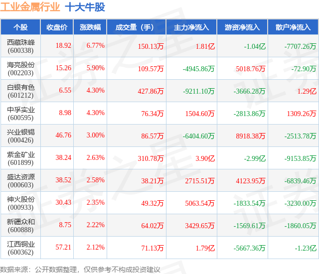 个股表现方面,工业金属行业当日领涨股为西藏珠峰(600338),该股当日报收18.92,上涨6.77%,成交量150.13万,主力资金净流入1.81亿元。海亮股份(002203)以上涨5.9%紧随其后,该股当日成交量109.57万,主力资金净流出4945.86万元。除此之外,白银有色(601212)、中孚实业(600595)、兴业银锡(000426)均进入当日牛股之列。具体个股列表见下表: