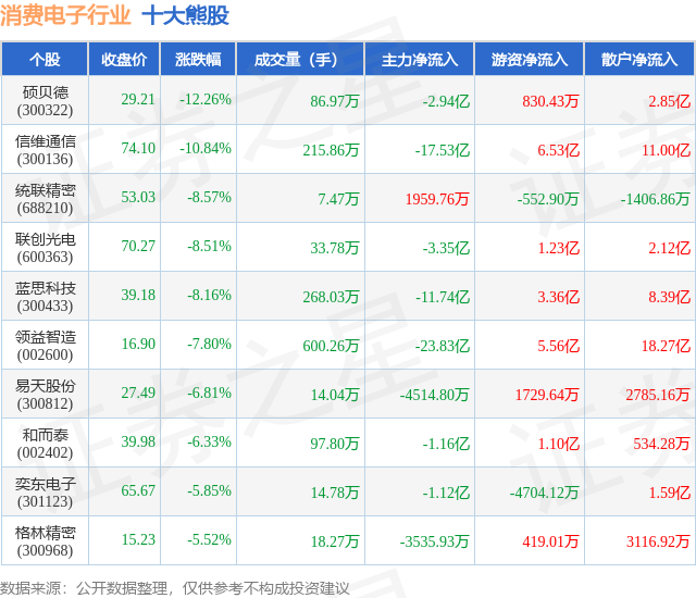 个股表现方面,消费电子行业当日领跌股为硕贝德(300322),该股当日报收29.21,下跌12.26%,成交量86.97万,主力资金净流出2.94亿元。信维通信(300136)以下跌10.84%紧随其后,该股当日成交量215.86万,主力资金净流出17.53亿元。除此之外,统联精密(688210)、联创光电(600363)、蓝思科技(300433)均进入当日熊股之列。具体个股列表见下表: