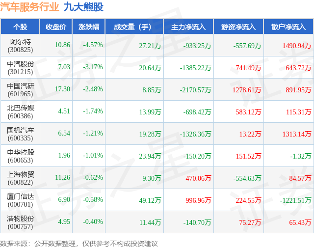 个股表现方面,汽车服务行业当日领跌股为阿尔特(300825),该股当日报收10.86,下跌4.57%,成交量27.21万,主力资金净流出933.25万元。中汽股份(301215)以下跌3.17%紧随其后,该股当日成交量20.64万,主力资金净流出1385.22万元。除此之外,中国汽研(601965)、北巴传媒(600386)、国机汽车(600335)均进入当日熊股之列。具体个股列表见下表: