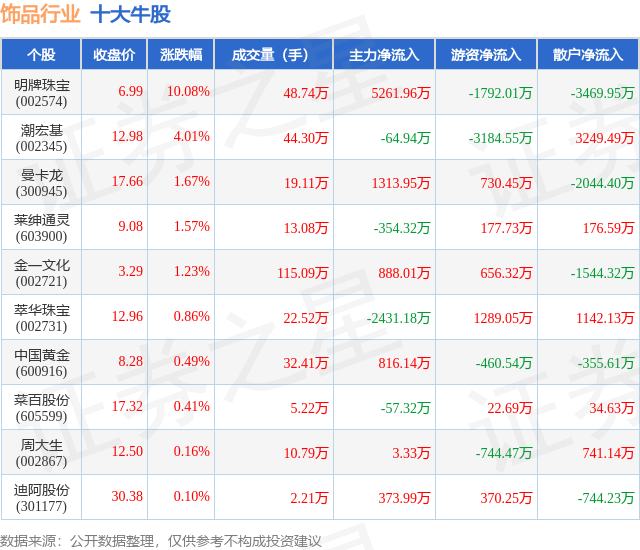 个股表现方面,饰品行业当日领涨股为明牌珠宝(002574),该股当日报收6.99,上涨10.08%,成交量48.74万,主力资金净流入5261.96万元。潮宏基(002345)以上涨4.01%紧随其后,该股当日成交量44.3万,主力资金净流出64.94万元。除此之外,曼卡龙(300945)、莱绅通灵(603900)、金一文化(002721)均进入当日牛股之列。具体个股列表见下表: