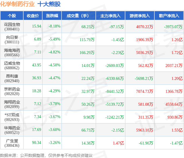 个股表现方面,化学制药行业当日领跌股为花园生物(300401),该股当日报收15.94,下跌8.18%,成交量68.23万,主力资金净流出97.15万元。向日葵(300111)以下跌5.49%紧随其后,该股当日成交量115.79万,主力资金净流出1.45亿元。除此之外,海南海药(000566)、迈威生物(688062)、昂利康(002940)均进入当日熊股之列。具体个股列表见下表: