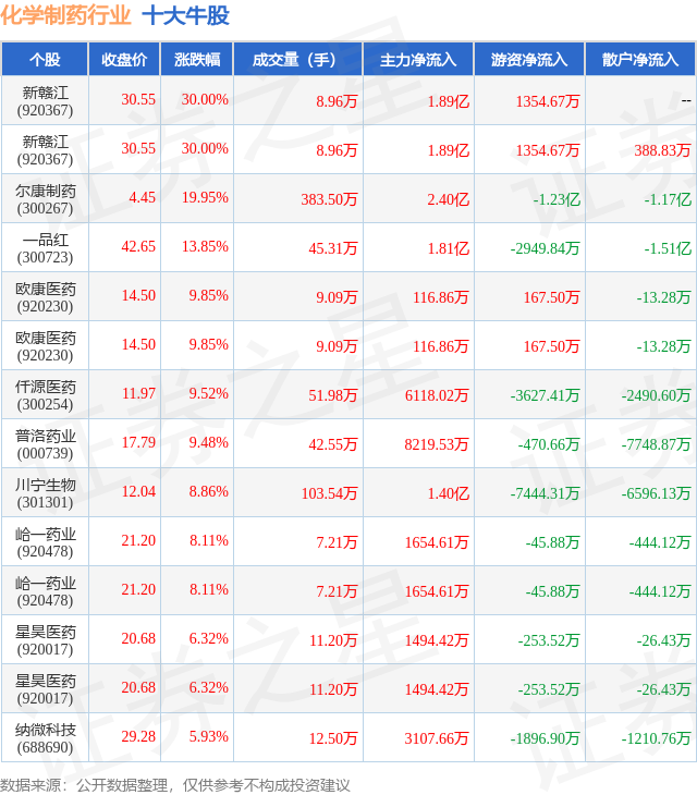 个股表现方面,化学制药行业当日领涨股为新赣江(920367),该股当日报收30.55,上涨30.0%,成交量8.96万,主力资金净流入1.89亿元。新赣江(920367)以上涨30.0%紧随其后,该股当日成交量8.96万,主力资金净流入1.89亿元。除此之外,尔康制药(300267)、一品红(300723)、欧康医药(920230)均进入当日牛股之列。具体个股列表见下表: