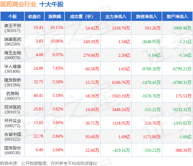个股表现方面,医药商业行业当日领涨股为漱玉平民(301017),该股当日报收19.43,上涨10.15%,成交量54.42万,主力资金净流入3318.7万元。瑞康医药(002589)以上涨10.06%紧随其后,该股当日成交量249.39万,主力资金净流入1.58亿元。除此之外,海王生物(000078)、华人健康(301408)、建发致新(301584)均进入当日牛股之列。具体个股列表见下表: