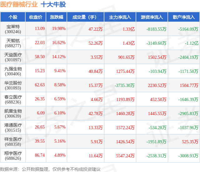 个股表现方面,医疗器械行业当日领涨股为宝莱特(300246),该股当日报收13.09,上涨19.98%,成交量47.22万,主力资金净流入1.33亿元。天智航(688277)以上涨16.62%紧随其后,该股当日成交量52.26万,主力资金净流入1.43亿元。除此之外,天益医疗(301097)、九强生物(300406)、华兰股份(301093)均进入当日牛股之列。具体个股列表见下表: