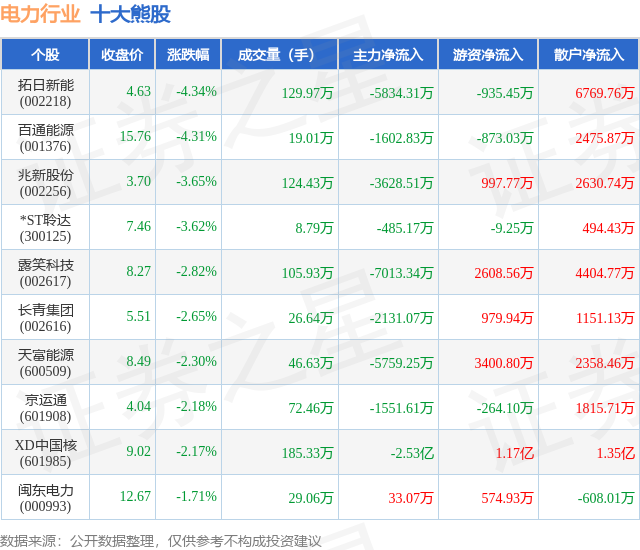 个股表现方面,电力行业当日领跌股为拓日新能(002218),该股当日报收4.63,下跌4.34%,成交量129.97万,主力资金净流出5834.31万元。百通能源(001376)以下跌4.31%紧随其后,该股当日成交量19.01万,主力资金净流出1602.83万元。除此之外,兆新股份(002256)、*ST聆达(300125)、露笑科技(002617)均进入当日熊股之列。具体个股列表见下表: