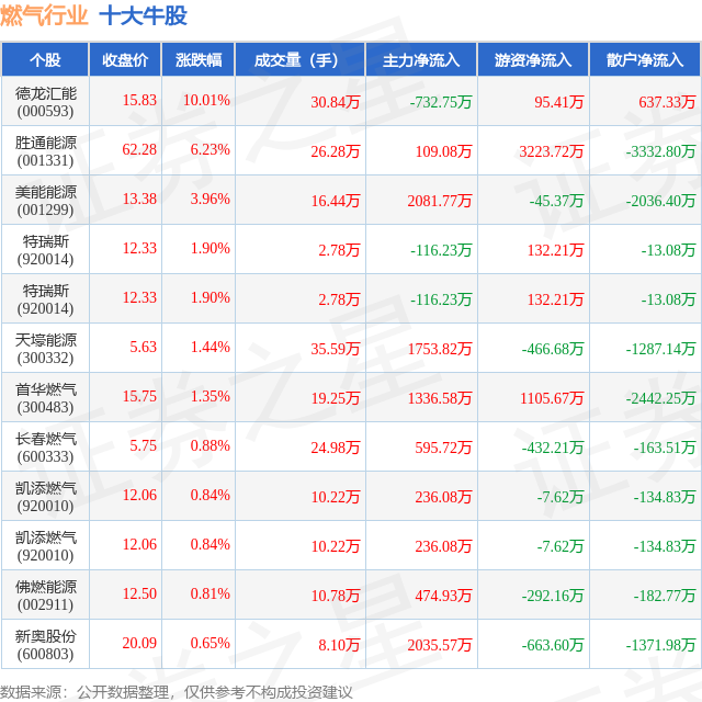 个股表现方面,燃气行业当日领涨股为德龙汇能(000593),该股当日报收15.83,上涨10.01%,成交量30.84万,主力资金净流出732.75万元。胜通能源(001331)以上涨6.23%紧随其后,该股当日成交量26.28万,主力资金净流入109.08万元。除此之外,美能能源(001299)、特瑞斯(920014)、特瑞斯(920014)均进入当日牛股之列。具体个股列表见下表: