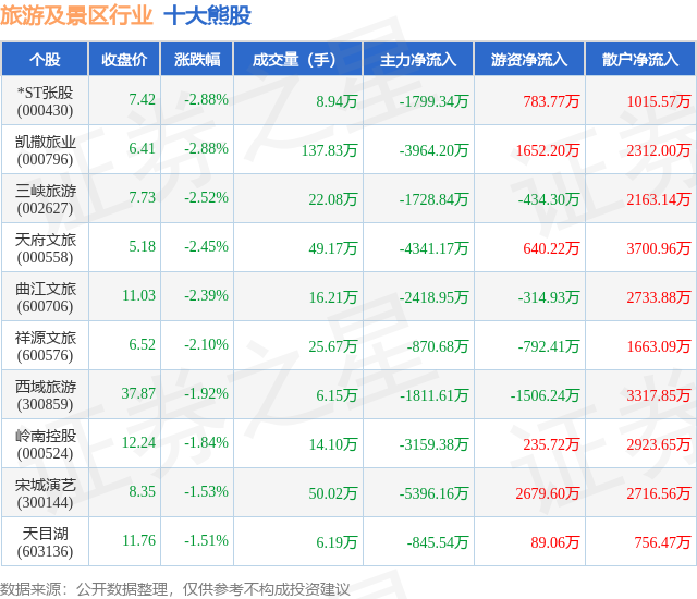 个股表现方面,旅游及景区行业当日领跌股为*ST张股(000430),该股当日报收7.42,下跌2.88%,成交量8.94万,主力资金净流出1799.34万元。凯撒旅业(000796)以下跌2.88%紧随其后,该股当日成交量137.83万,主力资金净流出3964.2万元。除此之外,三峡旅游(002627)、天府文旅(000558)、曲江文旅(600706)均进入当日熊股之列。具体个股列表见下表: