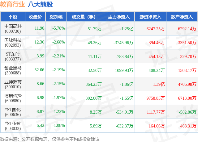 个股表现方面,教育行业当日领跌股为中国高科(600730),该股当日报收11.9,下跌5.78%,成交量51.79万,主力资金净流出1.25亿元。国脉科技(002093)以下跌2.68%紧随其后,该股当日成交量49.26万,主力资金净流出3745.96万元。除此之外,ST东时(603377)、创业黑马(300688)、豆神教育(300010)均进入当日熊股之列。具体个股列表见下表: