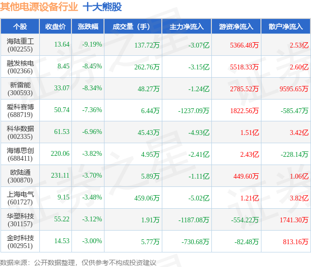 个股表现方面,其他电源设备行业当日领跌股为海陆重工(002255),该股当日报收13.64,下跌9.19%,成交量137.72万,主力资金净流出3.07亿元。融发核电(002366)以下跌8.45%紧随其后,该股当日成交量262.76万,主力资金净流出3.15亿元。除此之外,新雷能(300593)、爱科赛博(688719)、科华数据(002335)均进入当日熊股之列。具体个股列表见下表: