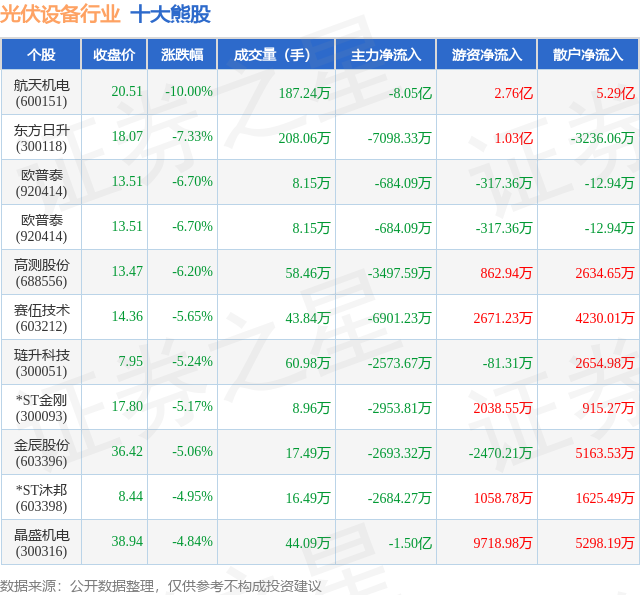 个股表现方面,光伏设备行业当日领跌股为航天机电(600151),该股当日报收20.51,下跌10.0%,成交量187.24万,主力资金净流出8.05亿元。东方日升(300118)以下跌7.33%紧随其后,该股当日成交量208.06万,主力资金净流出7098.33万元。除此之外,欧普泰(920414)、欧普泰(920414)、高测股份(688556)均进入当日熊股之列。具体个股列表见下表:
