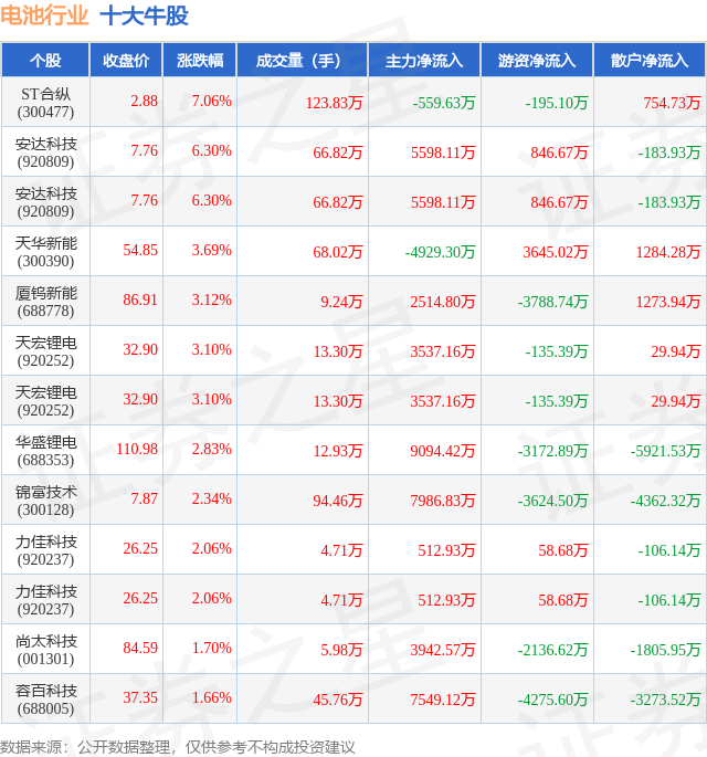 个股表现方面,电池行业当日领涨股为ST合纵(300477),该股当日报收2.88,上涨7.06%,成交量123.83万,主力资金净流出559.63万元。安达科技(920809)以上涨6.3%紧随其后,该股当日成交量66.82万,主力资金净流入5598.11万元。除此之外,安达科技(920809)、天华新能(300390)、厦钨新能(688778)均进入当日牛股之列。具体个股列表见下表: