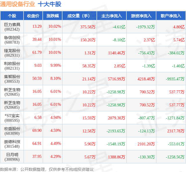 个股表现方面,通用设备行业当日领涨股为巨力索具(002342),该股当日报收13.29,上涨10.02%,成交量375.58万,主力资金净流出4.61亿元。鲁信创投(600783)以上涨10.01%紧随其后,该股当日成交量150.2万,主力资金净流出8.1亿元。除此之外,锋龙股份(002931)、利欧股份(002131)、集智股份(300553)均进入当日牛股之列。具体个股列表见下表:
