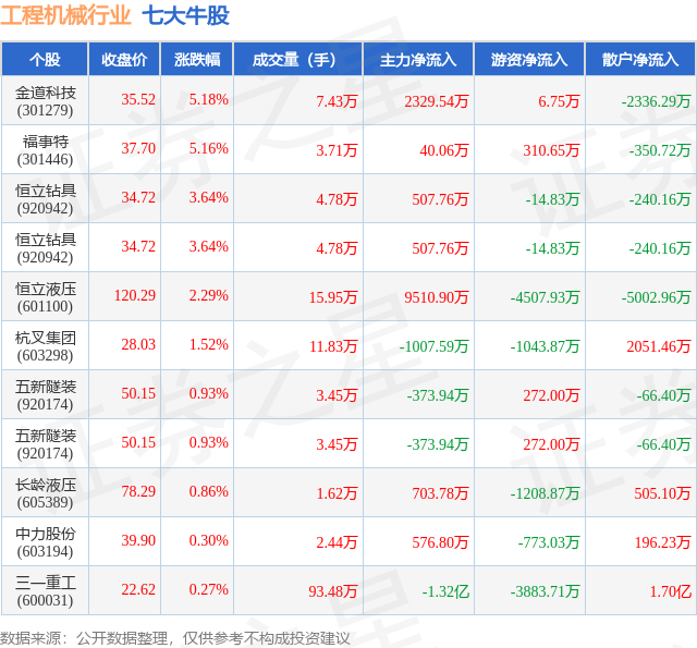 个股表现方面,工程机械行业当日领涨股为金道科技(301279),该股当日报收35.52,上涨5.18%,成交量7.43万,主力资金净流入2329.54万元。福事特(301446)以上涨5.16%紧随其后,该股当日成交量3.71万,主力资金净流入40.06万元。除此之外,恒立钻具(920942)、恒立钻具(920942)、恒立液压(601100)均进入当日牛股之列。具体个股列表见下表: