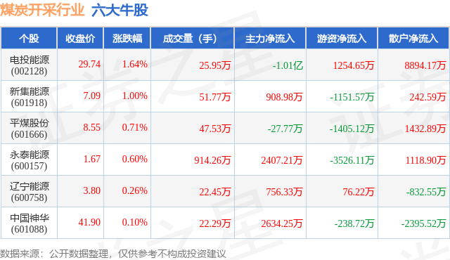 个股表现方面,煤炭开采行业当日领涨股为电投能源(002128),该股当日报收29.74,上涨1.64%,成交量25.95万,主力资金净流出1.01亿元。新集能源(601918)以上涨1.0%紧随其后,该股当日成交量51.77万,主力资金净流入908.98万元。除此之外,平煤股份(601666)、永泰能源(600157)、辽宁能源(600758)均进入当日牛股之列。具体个股列表见下表: