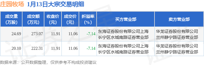 证券之星消息,1月13日庄园牧场发生大宗交易,交易数据如下: