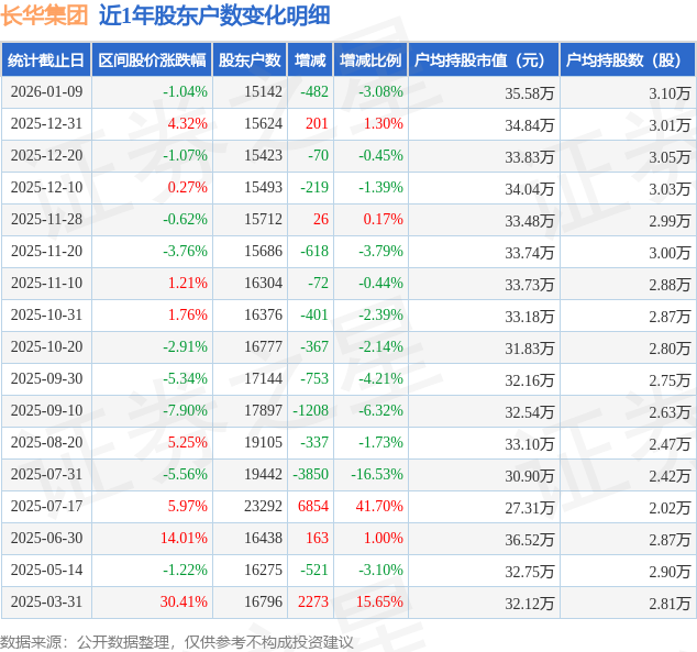 从股价来看,2025年12月31日至2026年1月9日,长华集团区间跌幅为1.04%,在此期间股东户数减少482.0户,减幅为3.08%。
