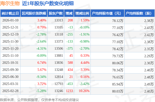 从股价来看,2025年12月31日至2026年1月10日,海尔生物区间涨幅为3.4%,在此期间股东户数增加208.0户,增幅为1.59%。